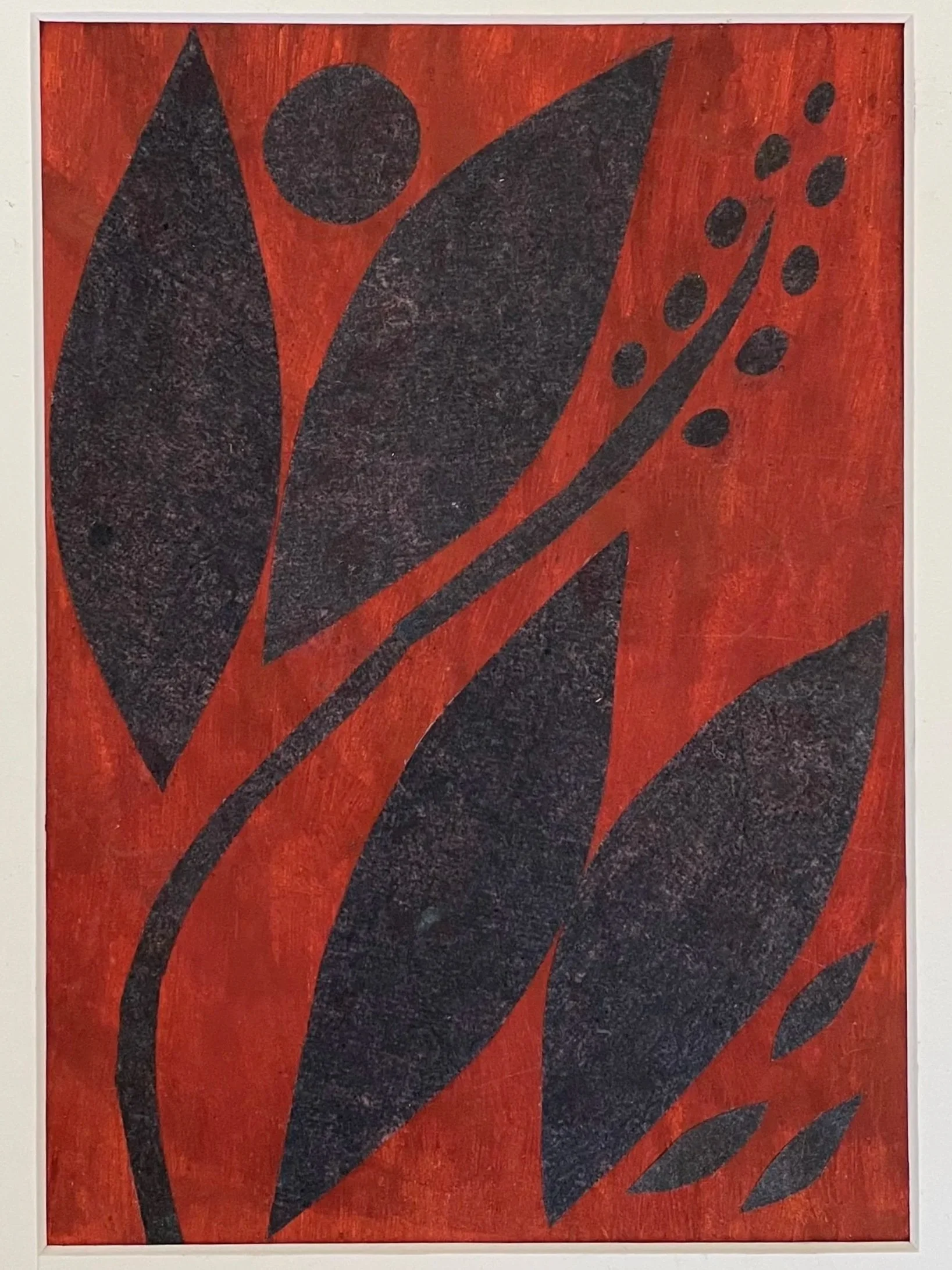 Almond Leaves in Indigo and Achiote. Kozo paper wood block printed with Indigo pigment, collaged on cartridge paper painted with Achiote paste. The Achiote paper was made while in residence at The Mauser Foundation in Costa Rica. Shown in On Dreaming at Northern Print, 2025